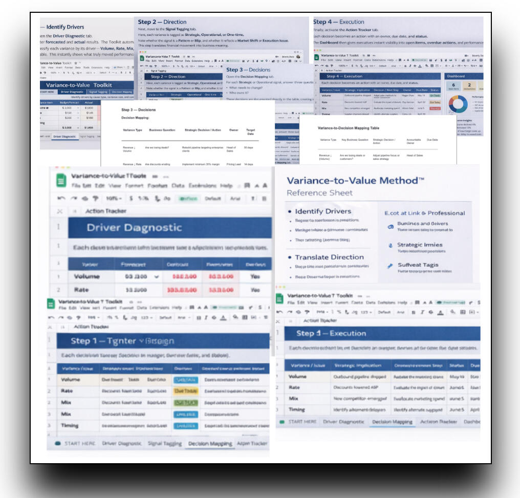 Most finance teams spend months explaining budget misses. The Variance-to-Value Method™ transforms variance analysis into a repeatable, strategic decision engine that teams and executives can use over and over again. This toolkit equips finance leaders to drive performance, alignment, and accountability — fast.
